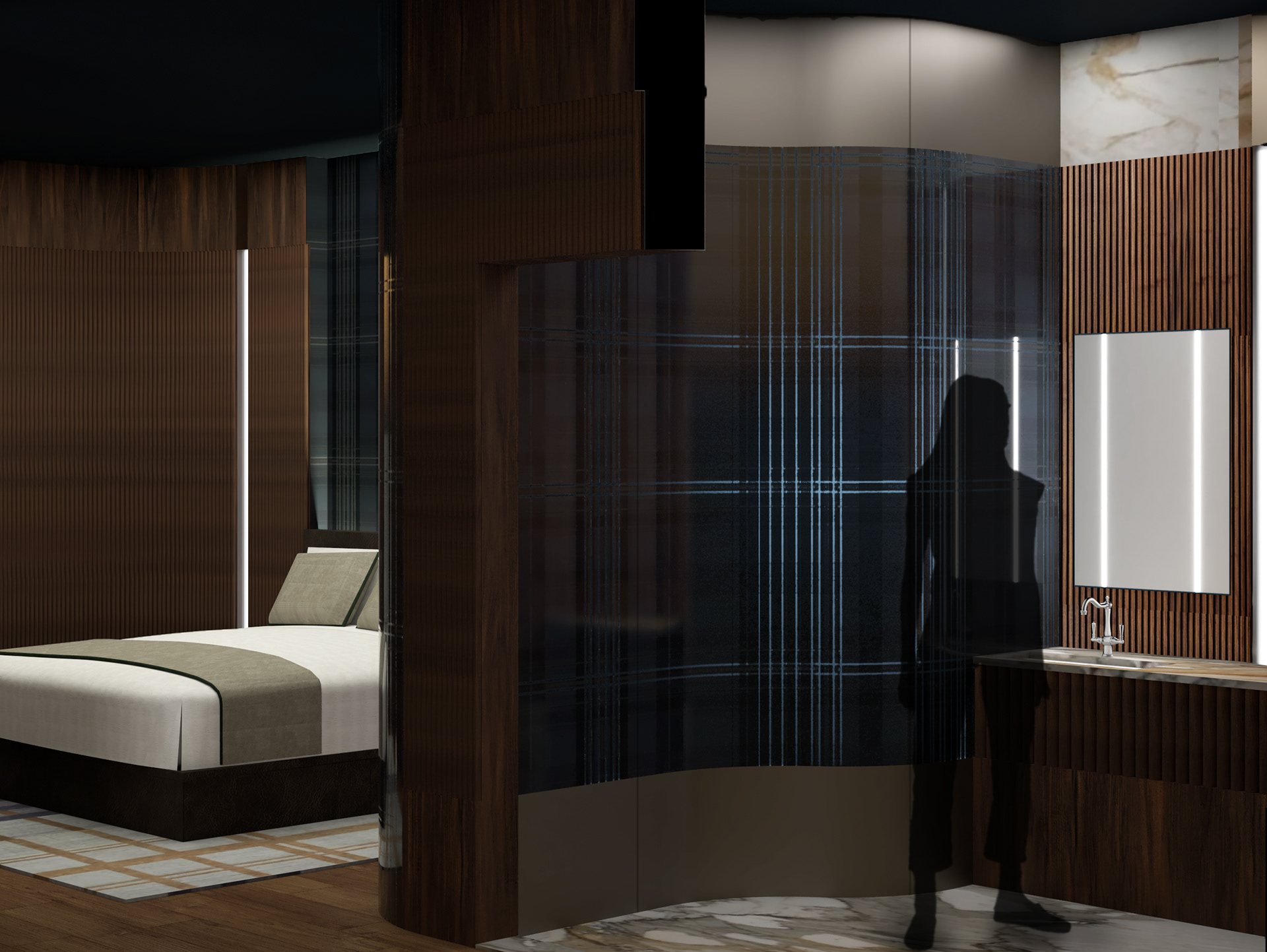 This short project asked students to design a hotel room featuring a central glass element. I chose to locate my concept in Scotland, where a moody palette of blues and browns compliments the drama of the surrounding landscape. In the bathroom, a set of curved, custom laminated plaid glass panels contour the shower and screen the occupant from the main sleeping area.