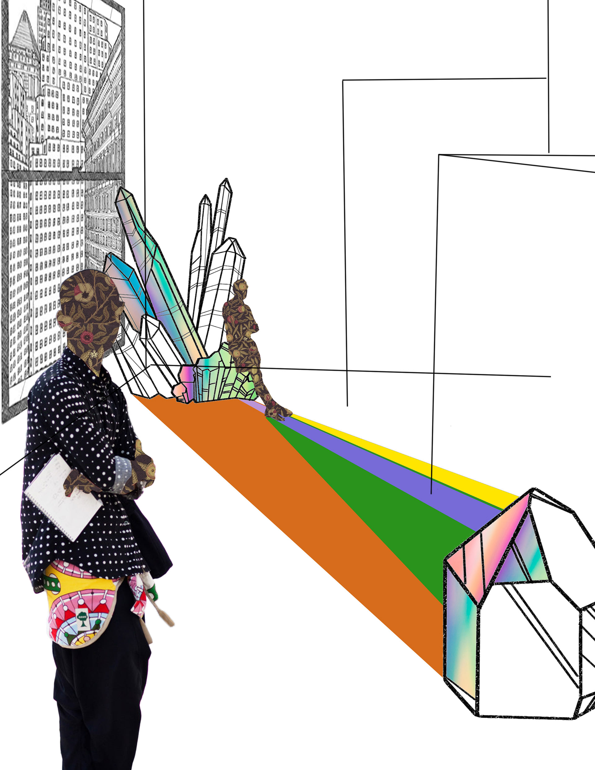 In a nod to the organization's first prize competition in the field of space exploration, the materials for this project center on the use of dichroic glass and film. Dichroic glass has been around in some form since antiquity, but modern dichroic materials were developed by NASA and later commercialized for use in architecture, design, and other industries. To maximize the material's optical effects in the space, large geode-like structures become the central design elements, seen below in the main staircase on the first floor and the enclosed workspaces on the second floor. Viewed from different angles and in variable natural light conditions, each facet of these geodic analogues works to subtly remind occupants of the passing hours and changing seasons.